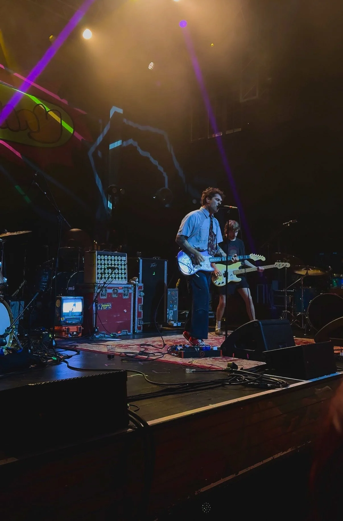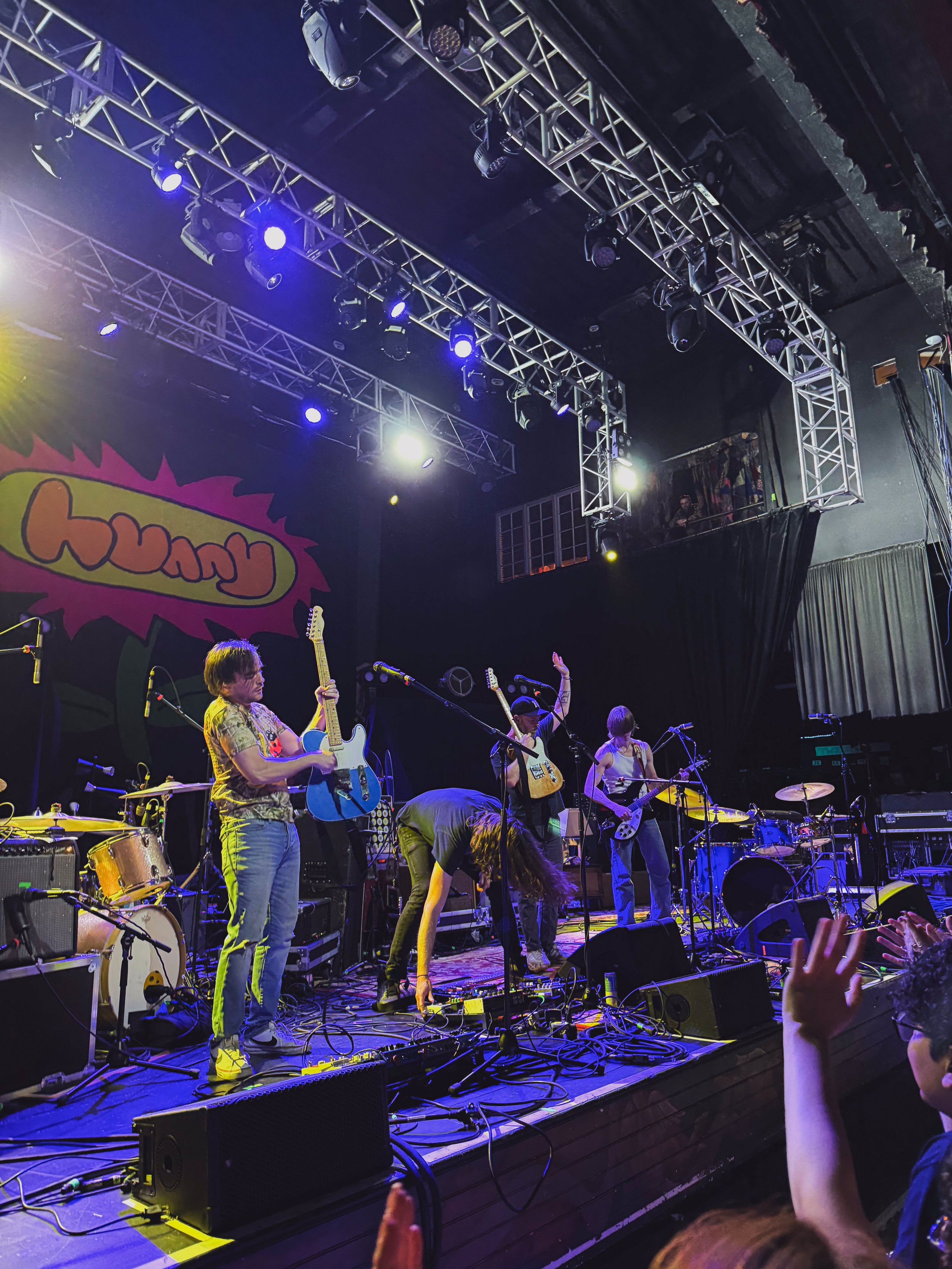 Next up was indie-pop rock band HUNNY. This set really took me back to being blissfully thirteen. While I hadn’t heard their music before the show, the stage setup—with the colorful banner, moody lights, tube TV, and layered Persian rugs—made me feel like I was reliving the Wallows Remote, Peach Pit era of teen summer. Promoting their new album, SPIRIT!, their fans took over the front row decked out in spirit jerseys to shout back the lyrics to songs new and old back to vocalist Jason Yarger. Jason brought a ton of fun personality and energy to the set, casually ripping his vape with a smile stored in his carpenter jeans and getting the whole room to jump and dance along.