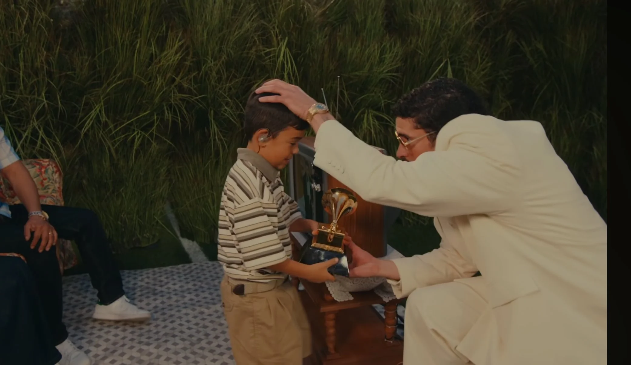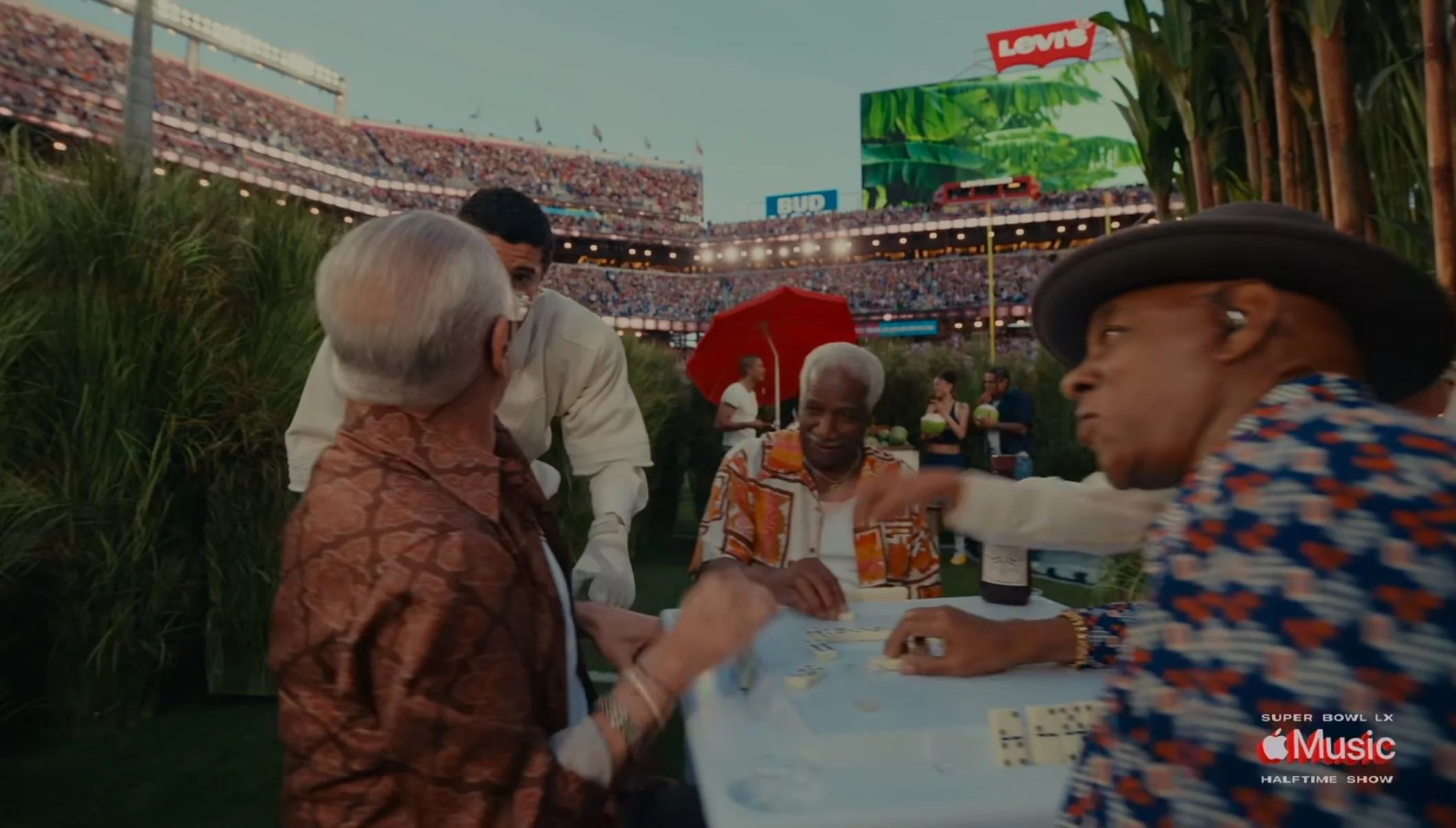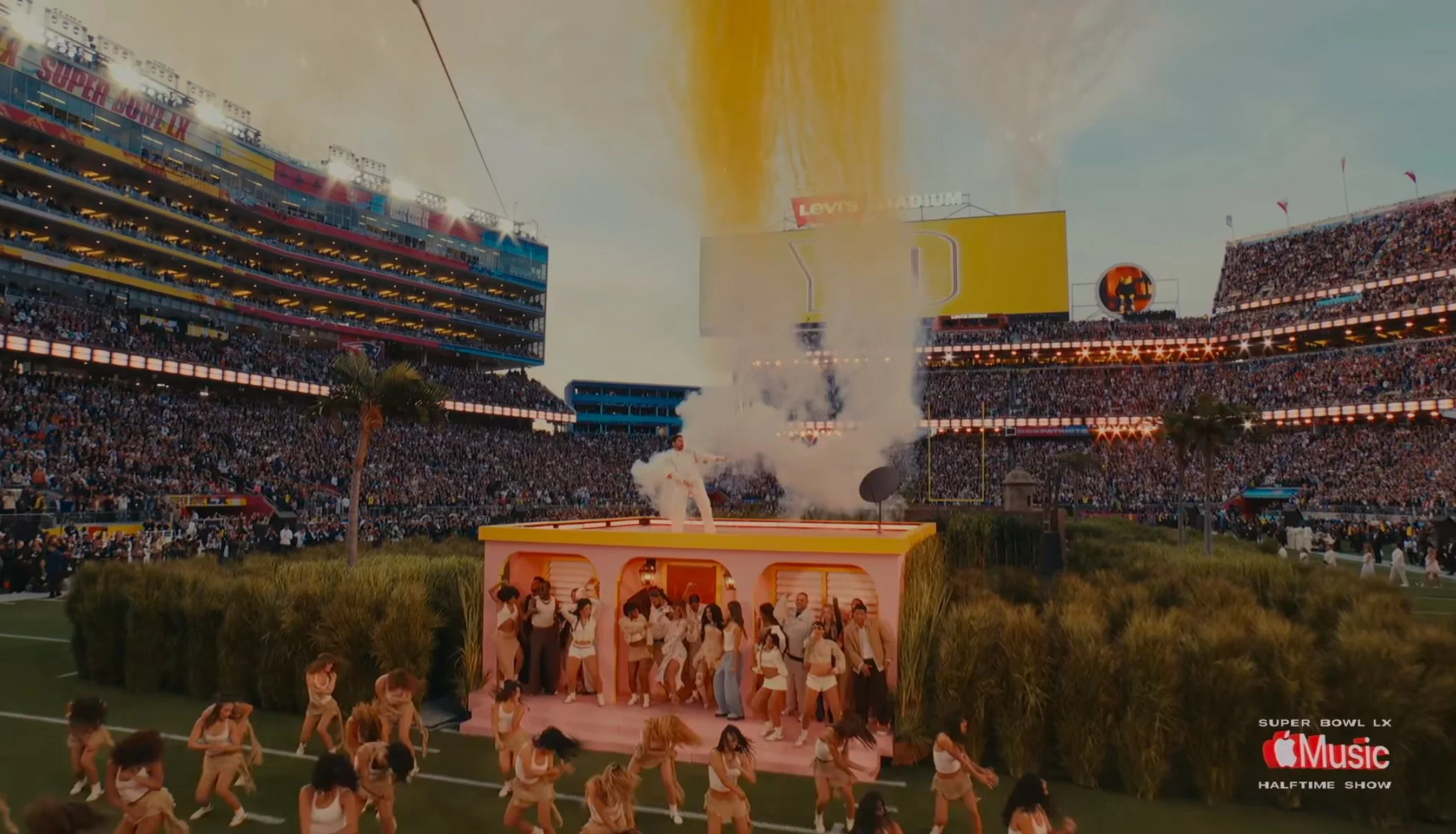 Past the bodega, a break from the noise reveals a young Benito watching his most recent emotional Grammy speech. The setting of his family in the living room watching him on TV shows that he became the representation he wanted to see growing up. Then handing his past self the Grammy made the dream of becoming the greatest tangible. Calling back to earlier in the show, where Benito exudes gratitude for his support system, staring down the barrel of the camera into the eyes of millions, he speaks directly to the audience, just as he once might have needed someone to speak to him: “My name is Benito Antonio Martínez Ocasio. And today I’m here at Super Bowl 60, it’s because I never, never stopped believing in me. And you should, you should believe in yourself too. You’re more valuable than you think, believe me.”